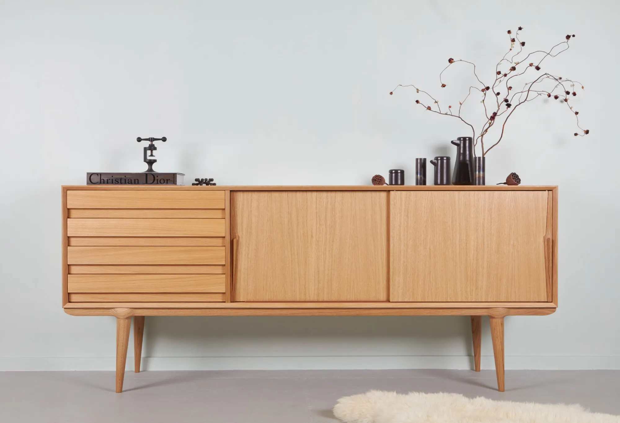 The stunning 'Model 18' Sideboard is a minimalist, decidedly organic offering raised on slender, tapered legs. The design showcases the company's signature knife-blade handles and sharp linear detailing.
