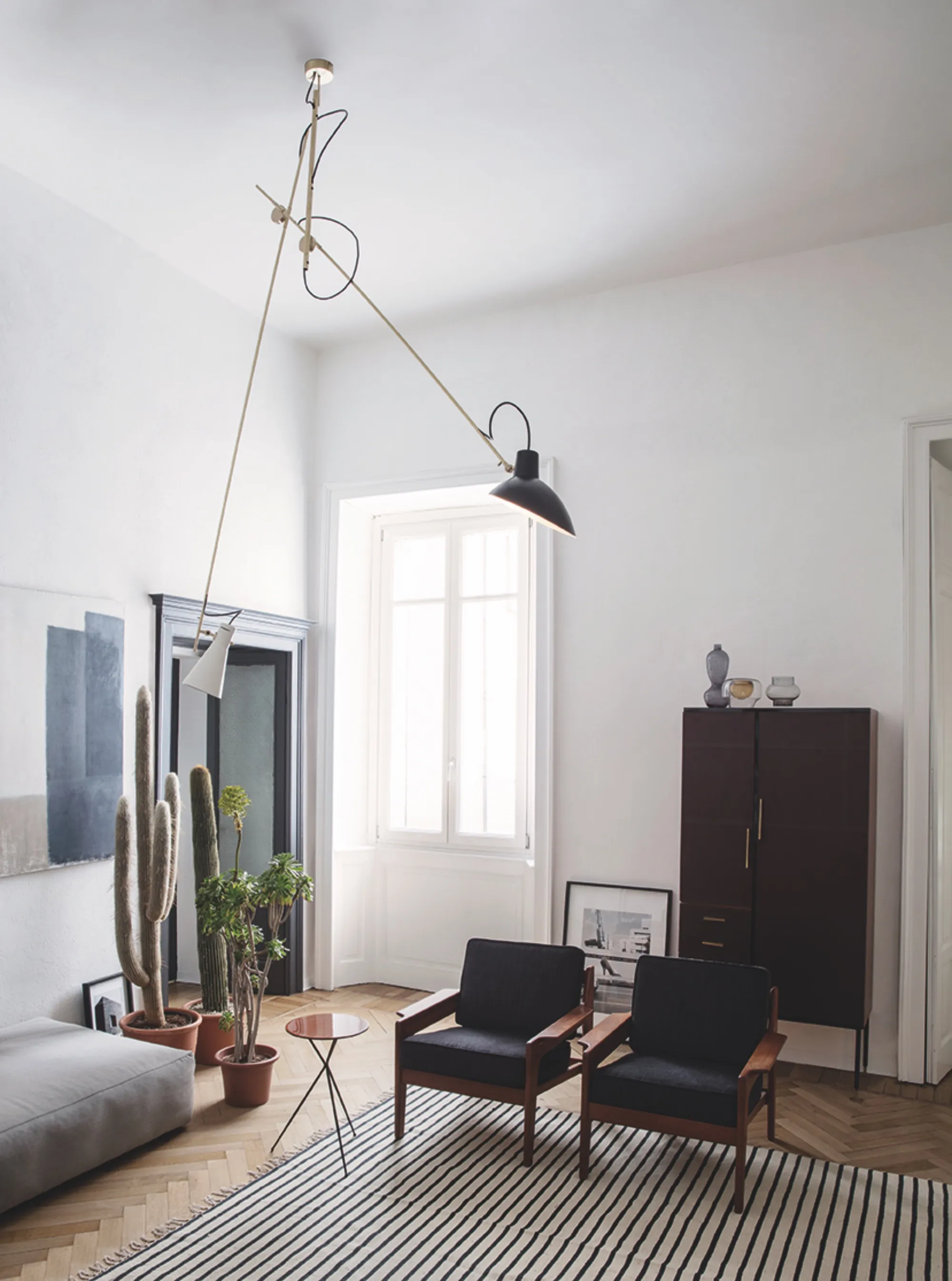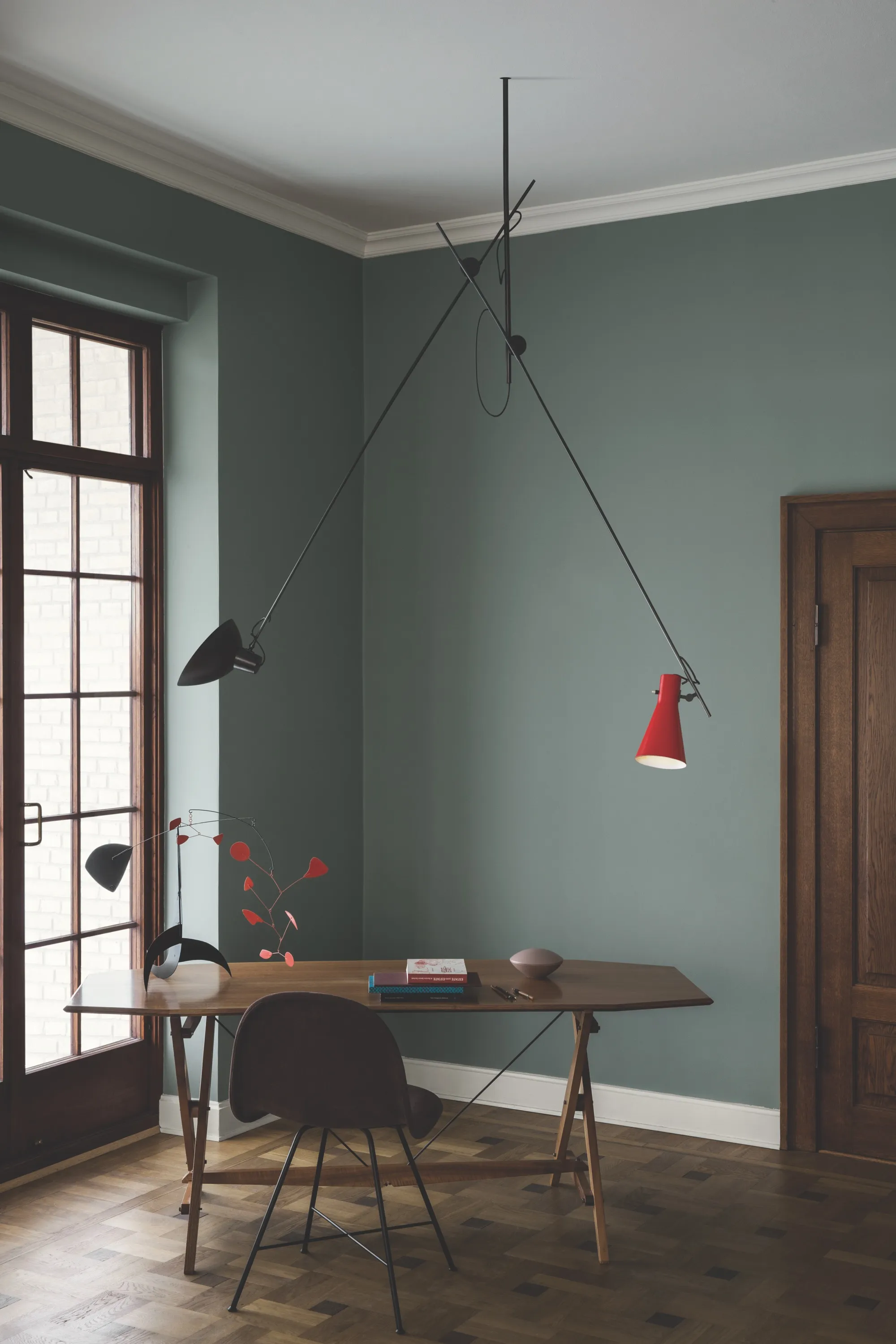 With a distinctive dual-stemmed construction, it features two uniquely shaped reflectors, one narrow and one wide. The fixture and the reflectors can be adjusted to many different positions, enabling a wide variety of both downward and upward lighting at the same time. The invitingly playful design encourages dynamic lighting compositions.