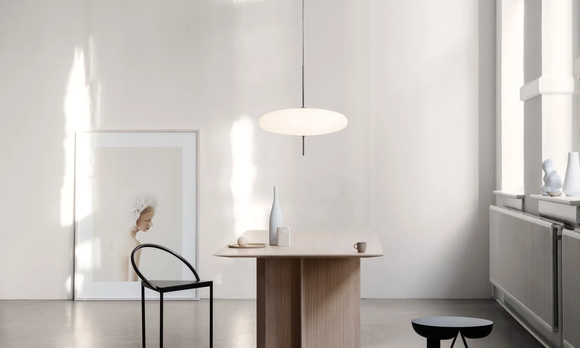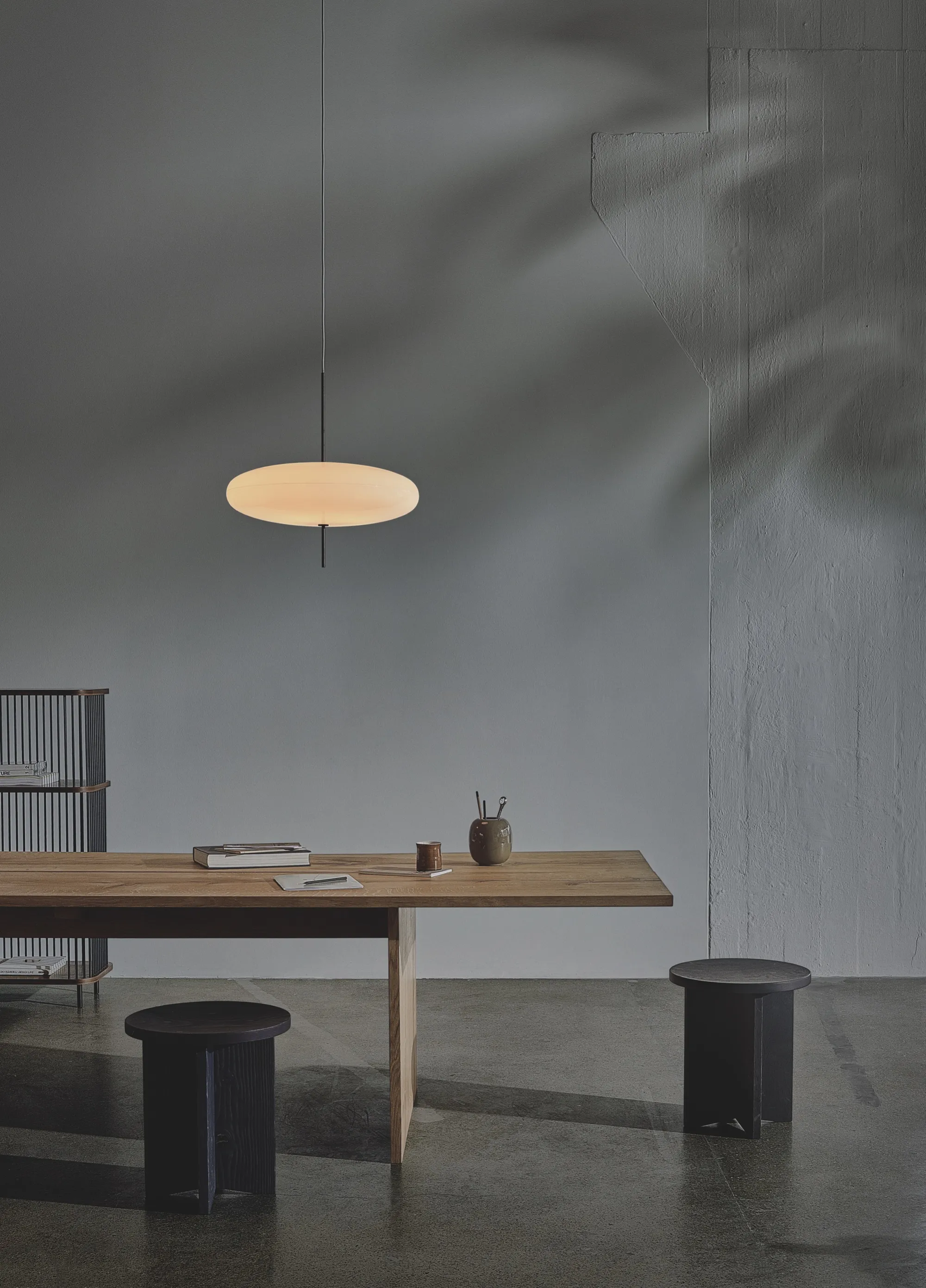 The luminaire was relaunched by Astep in 2016, which also introduced a black version where the upper saucer is finished with a soft-touch coating. This leaves the lower diffuser as the only light source, creating a more intimate light space and a strong, graphic expression. In a continuation of the original idea, five LED bulbs provide the lighting in both versions.