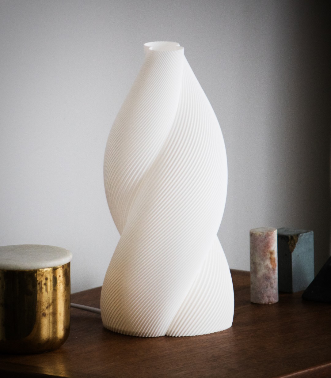 Cam works exclusively with recycled PLA, a renewable polymer made from corn and sugarcane, sourced locally from a company that transforms post-industrial food packaging and recycled plastics into high quality PLA filament. It’s a slow, intentional approach to making — one rooted in responsibility and craft.