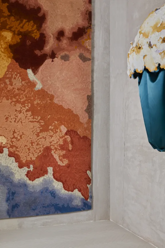 Accustomed to large scale frescos, murals and sculptures, Edoardo Piermattei worked from the bottom up and his creative process underwent a reversal: starting from an aerial view. An interpretation from above that evokes the link of the original divine meaning of the term “Dag allah”. Piermattei considers Dagallà as a link that eliminates any kind of distance, physical and temporal; a symbol of coexistence between past and present, between before and after that responds to the urge to express shapes, colours and languages on the surface of a rug.