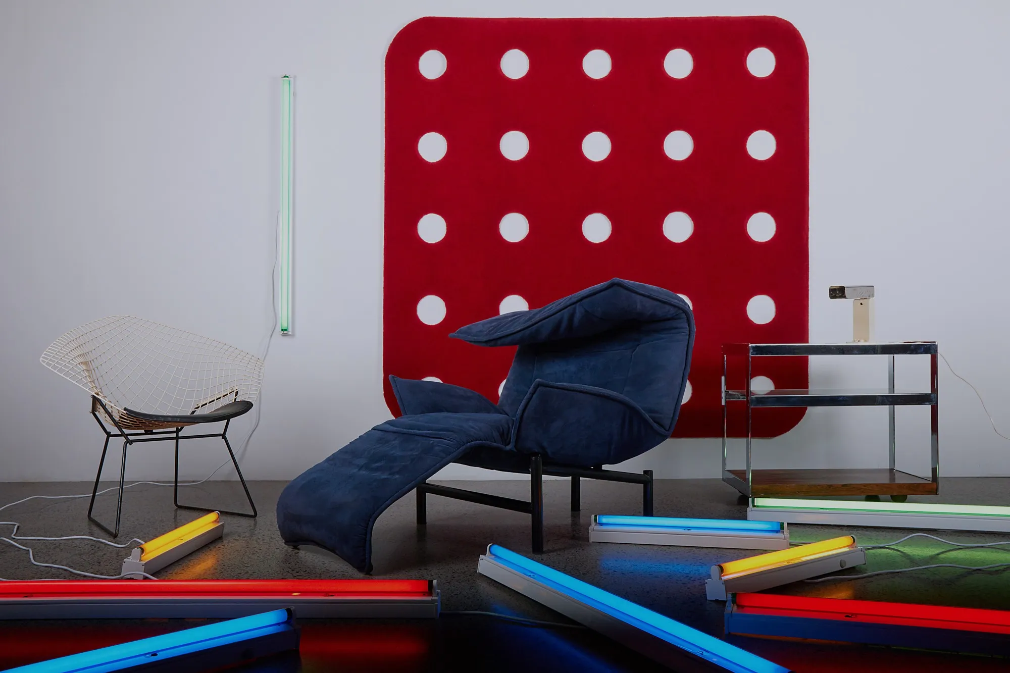 This collaboration with celebrated installation artist John Lyall takes its inspiration from the Meccano toys which became popular playthings for children in the mid 20th century. Lyall describes the "rugs with holes" as his "most minimal artwork; they are irrevocably Meccano, they hover between a colour presence on a floor space, and a conversation with an actual scale metal piece of an engineering toy".