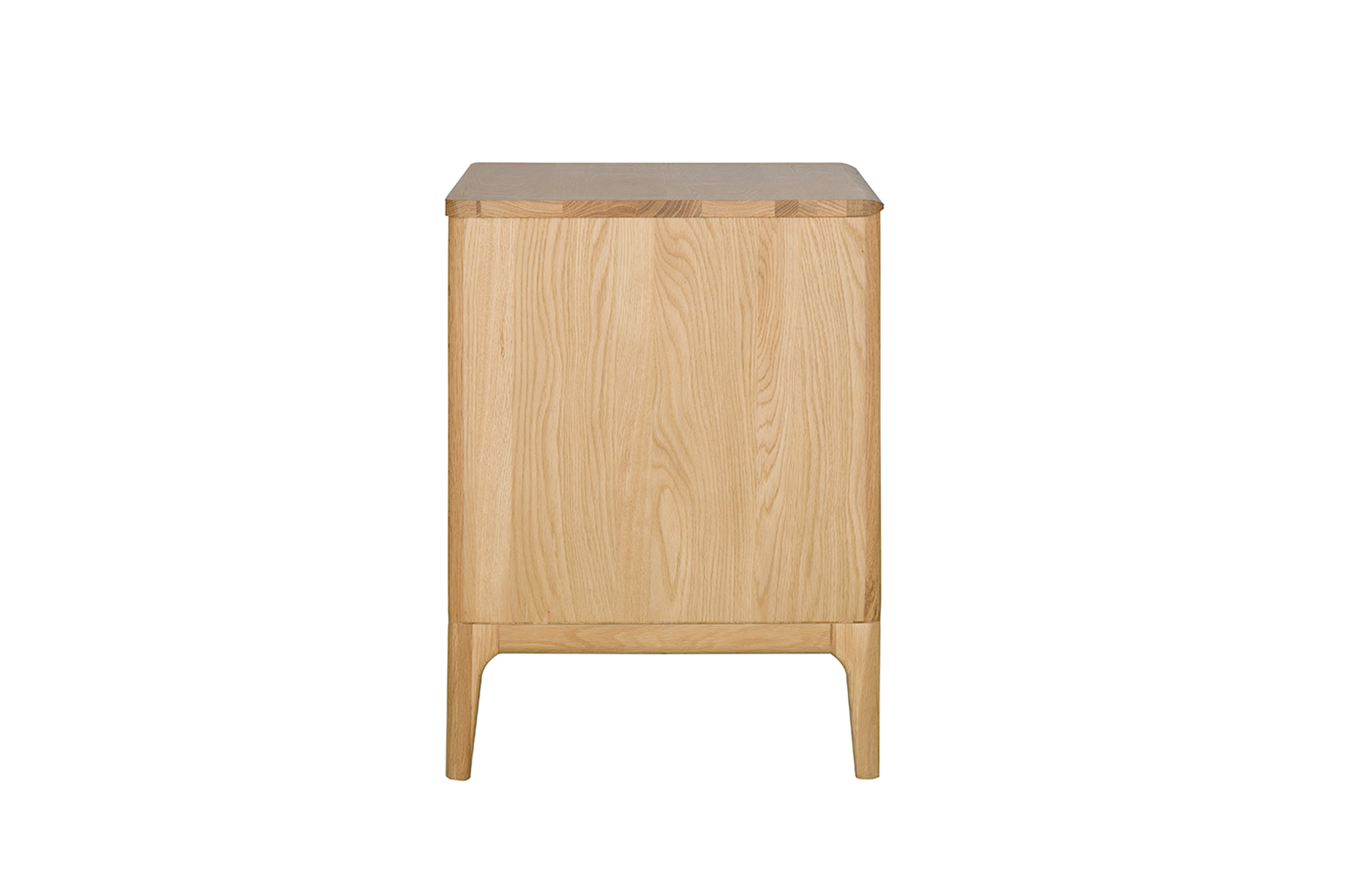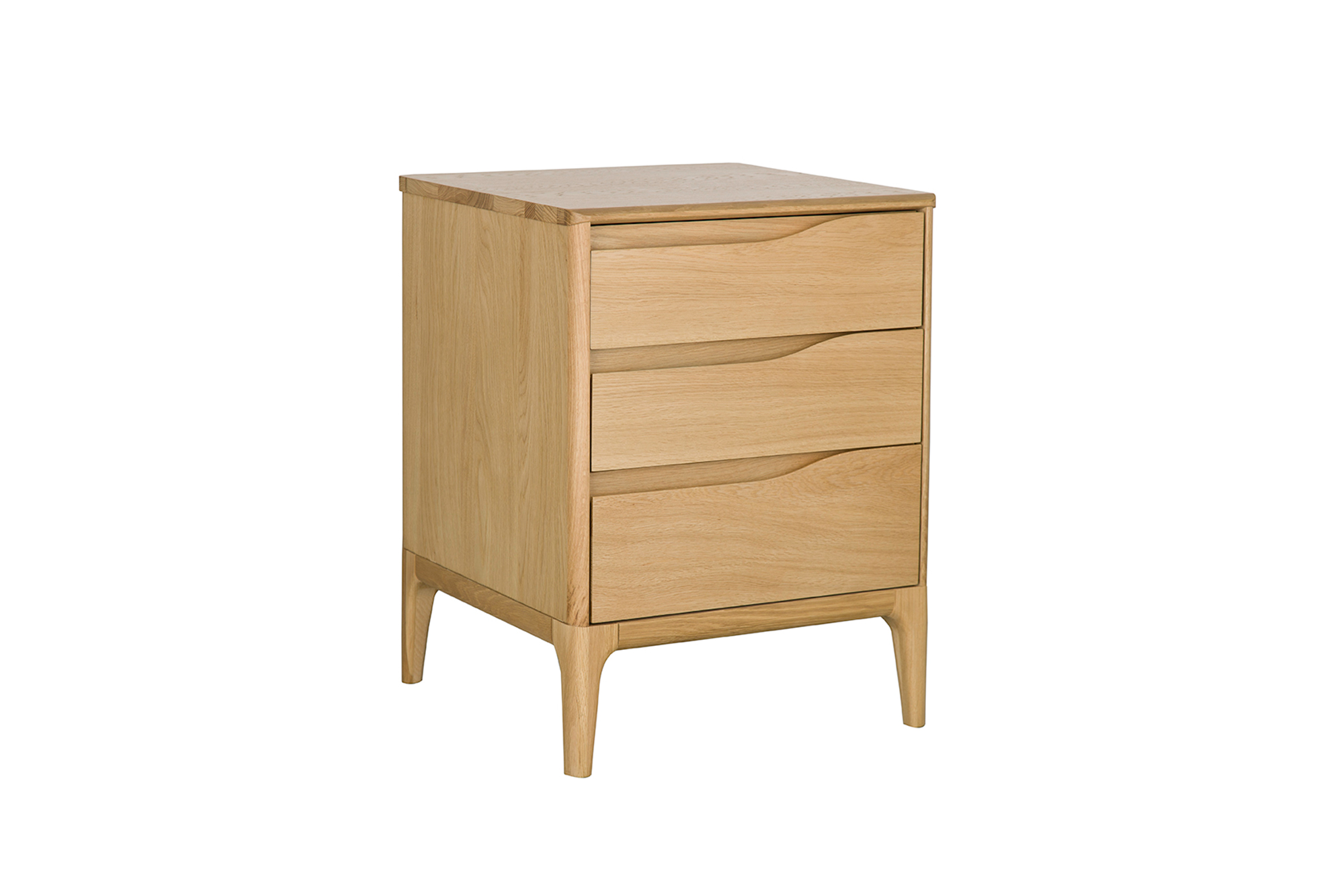 The Rimini 3-drawer bedside cabinet in light oak brings quiet luxury to the bedroom, pairing generous storage with an elegant lightness of form. Its sculpted cutaway drawer pulls echo the range’s sleek, contemporary character, while clean lines, gentle curves and soft form profiling create a calming silhouette.