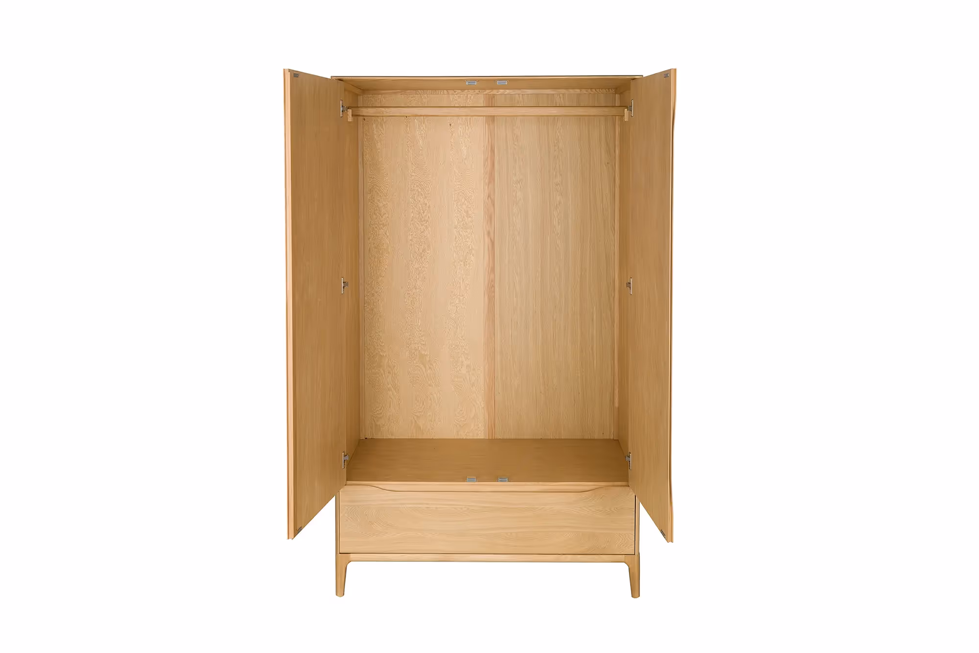 Contemporary and elegant, the Rimini 2-Door Wardrobe highlights the distinctive grain of the light oak in this piece. The smooth, sculpted and chamfered edge runs vertically through the doors for easy opening. Within the wardrobe is generous storage space for hanging clothes plus a deep drawer in the base.