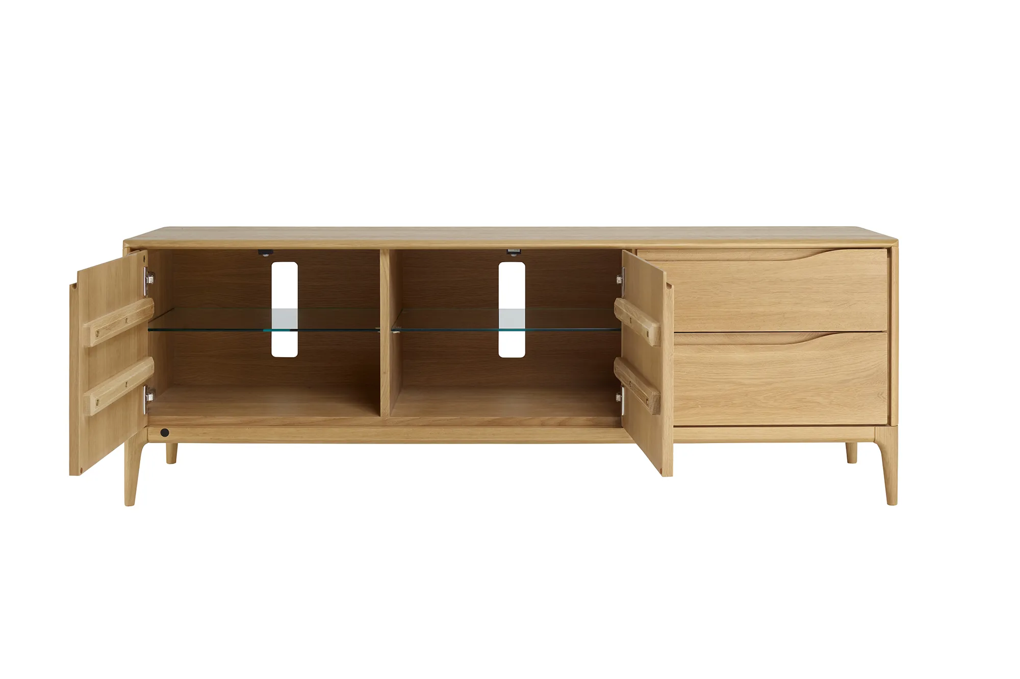 Crafted from sustainable pale oak with a clear matt lacquer, the Romana Wide IR TV Unit marries discreet technology with tactile detailing. A cupboard houses your digital and AV equipment, complemented by two soft close drawers, while the integrated IR eye lets you use remotes with digiboxes neatly hidden behind closed wooden doors.