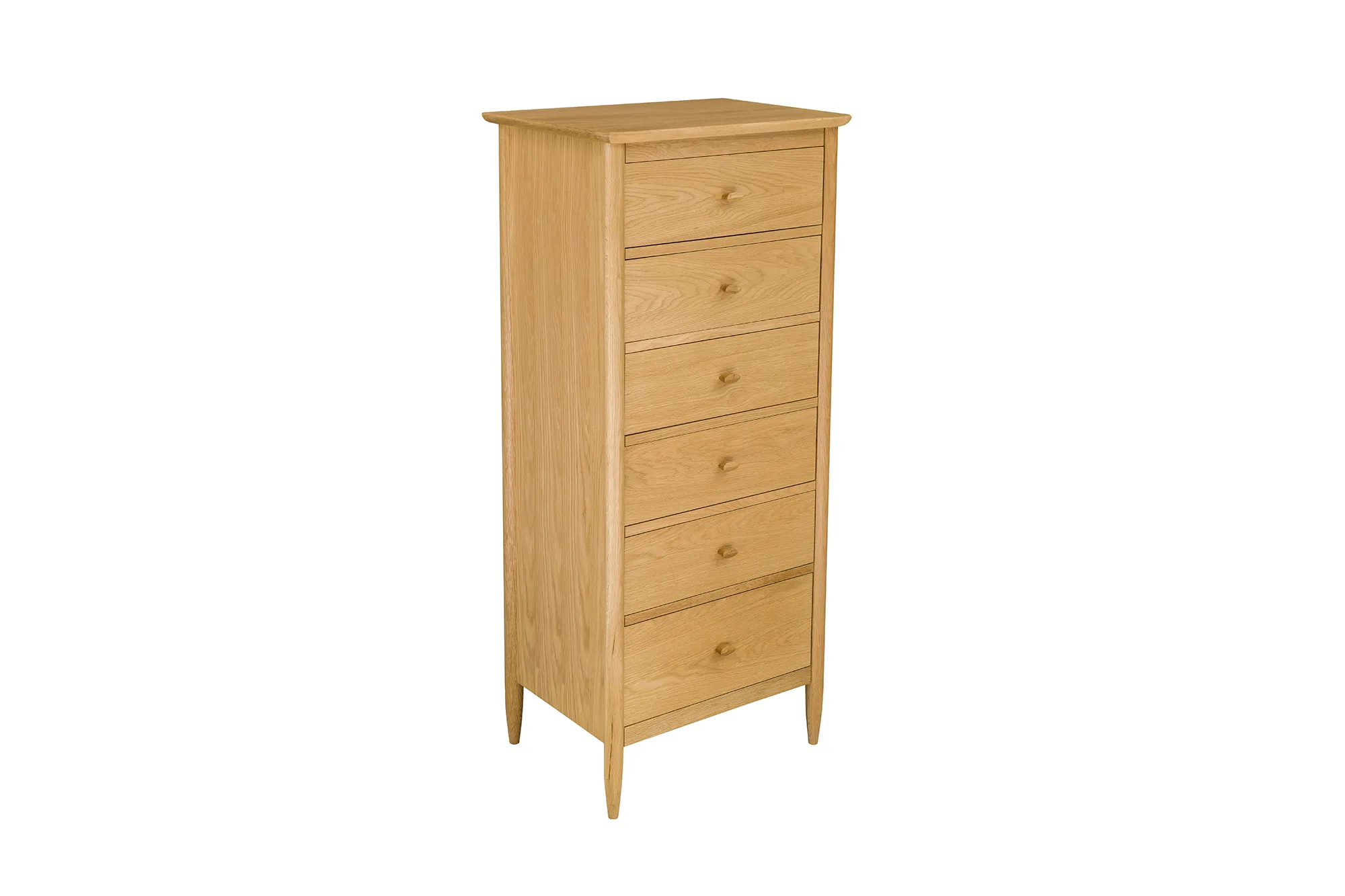 The Teramo 6-Drawer Tall Chest comprises the familiar tapered turned shapes in the legs and curved profiles on the top panel, as well as a shaker drawer layout, creating the simple signature feel. Offering six deep drawers, this bedroom furniture provides ample storage. The double chamfered edges on the traditional oval handles create a defined and modern profile and are wonderfully tactile.