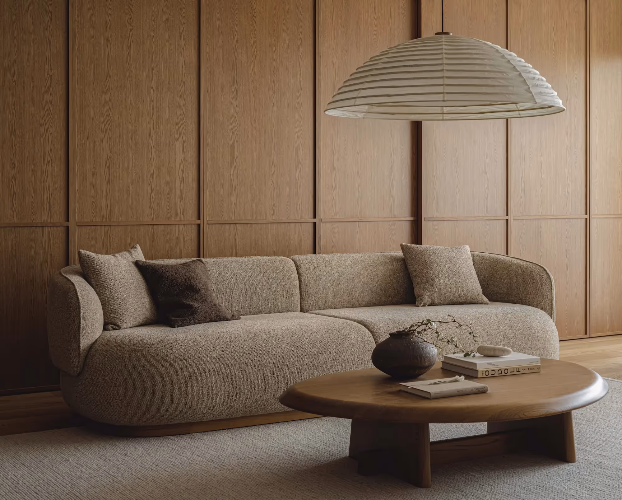 A plinth made of cut-out natural wood supports the sofa, enabling the feeling of sitting on a small pebble. Organic lines and substantial volume contribute to the space’s stability.