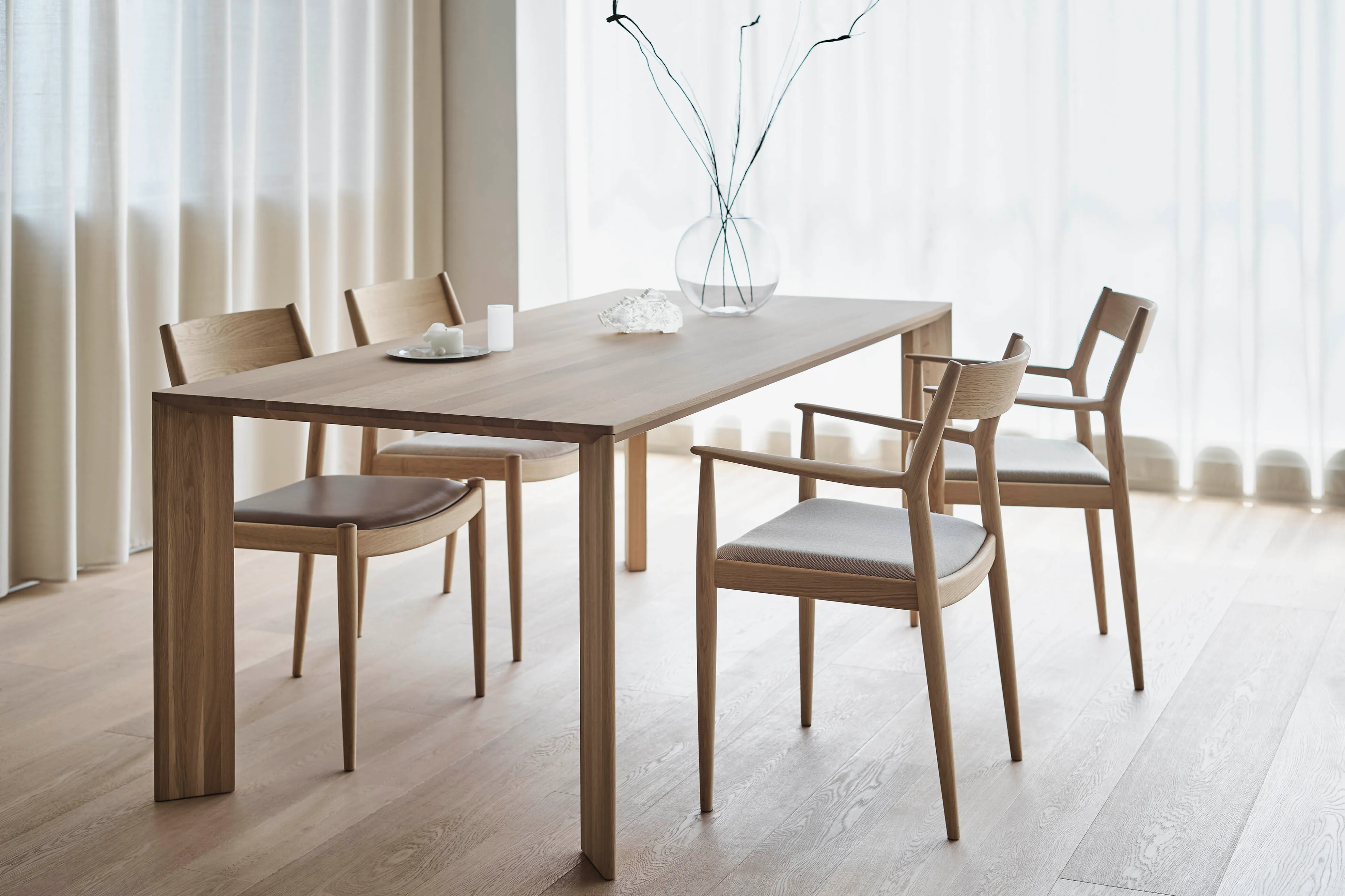 The A-DT02 Dining Table is one of the tailor-made furniture pieces that make up the forth collection of Karimoku Case Study, the Azabu Residence collection. Keiji Ashizawa Design and Norm Architects' shared belief in the use of natural materials and a muted colour palette lies as the foundation of the project, characterised by the focus on tactile, soft-minimal and timeless qualities.