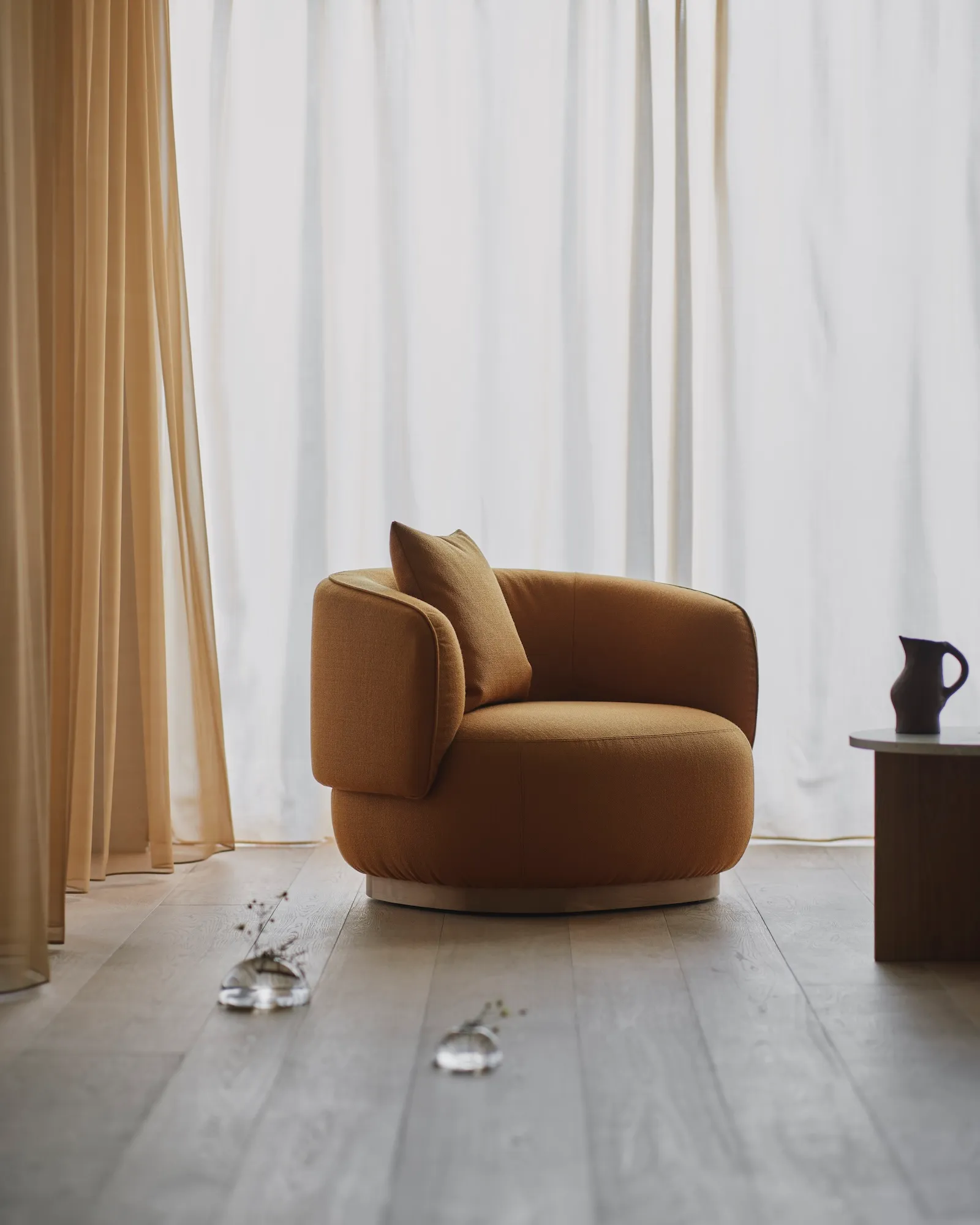 A plinth made of cut-out natural wood supports the sofa, enabling the feeling of sitting on a small pebble. Organic lines and massive volume contribute to the space’s stability. The single-seater sofa offers a relaxing, enveloped seating experience, while the three-seater sofa, with its spacious seat, offers the functionality of a daybed.