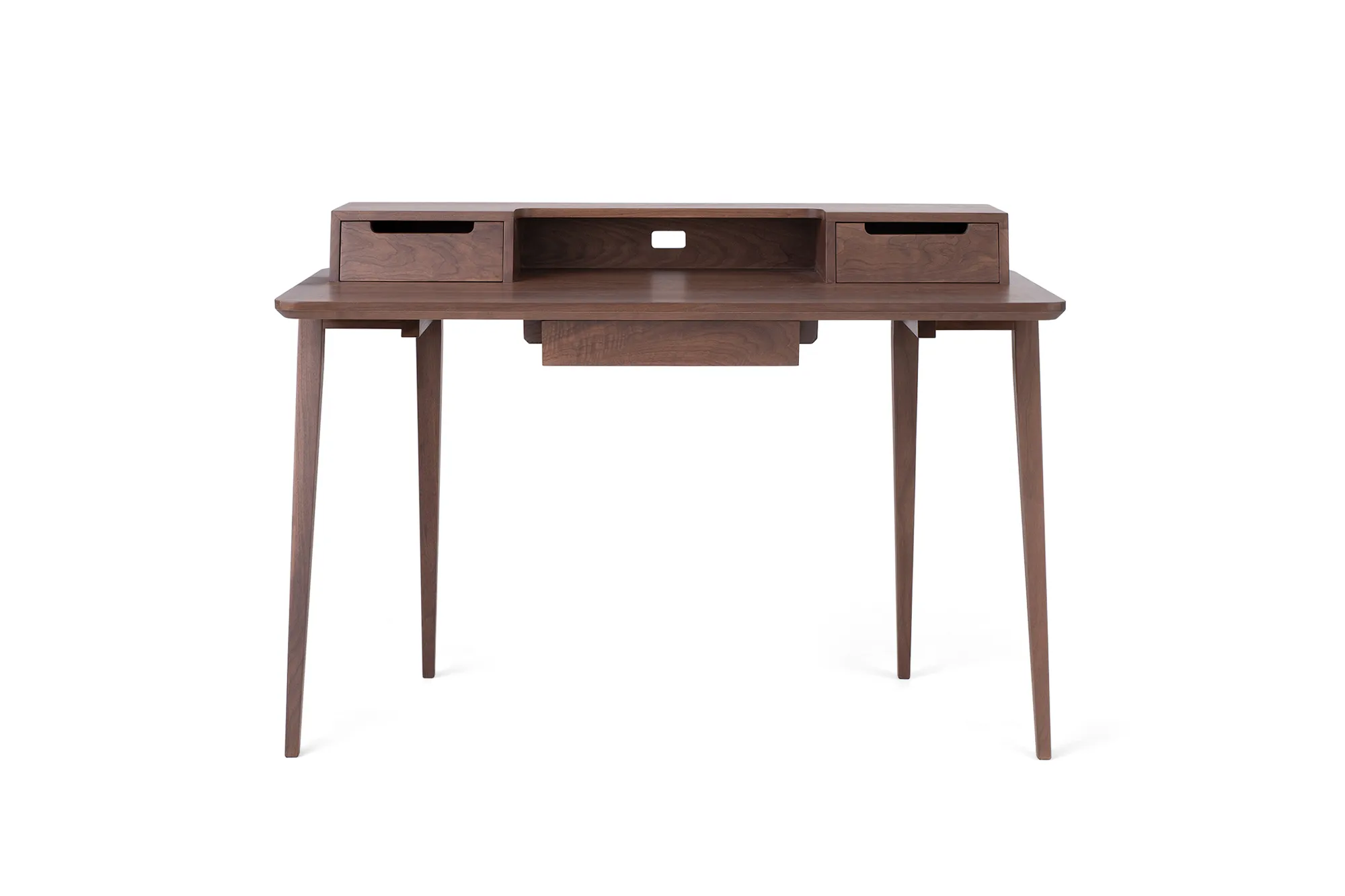 The Treviso Desk balances timeless elegance with everyday utility. Launched in 2009, its unapologetically angular silhouette features an oblique profile, tilted solid-wood legs and discreet, built-in drawers. A generous tabletop offers room for laptops, notebooks and supplies, while two smaller drawers and a hidden underside compartment keep essentials organized.