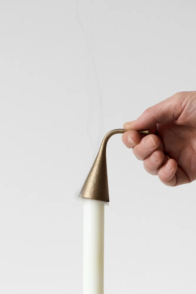 Sammu takes its name from ‘kynttilänsammutin’, the Finnish word for candle snuffer, but the root word ‘sammu’ is slang for having extinguished a fire or put out a lamp. It makes a great pairing with the Nedre Foss’ Ildhane candlestick, also designed by Julie and Mika Tolvanen. Over time, Sammu’s brass surface will develop a sophisticated, lively patina – or, if you prefer, you can maintain the sheen of the brass by polishing the surface regularly.