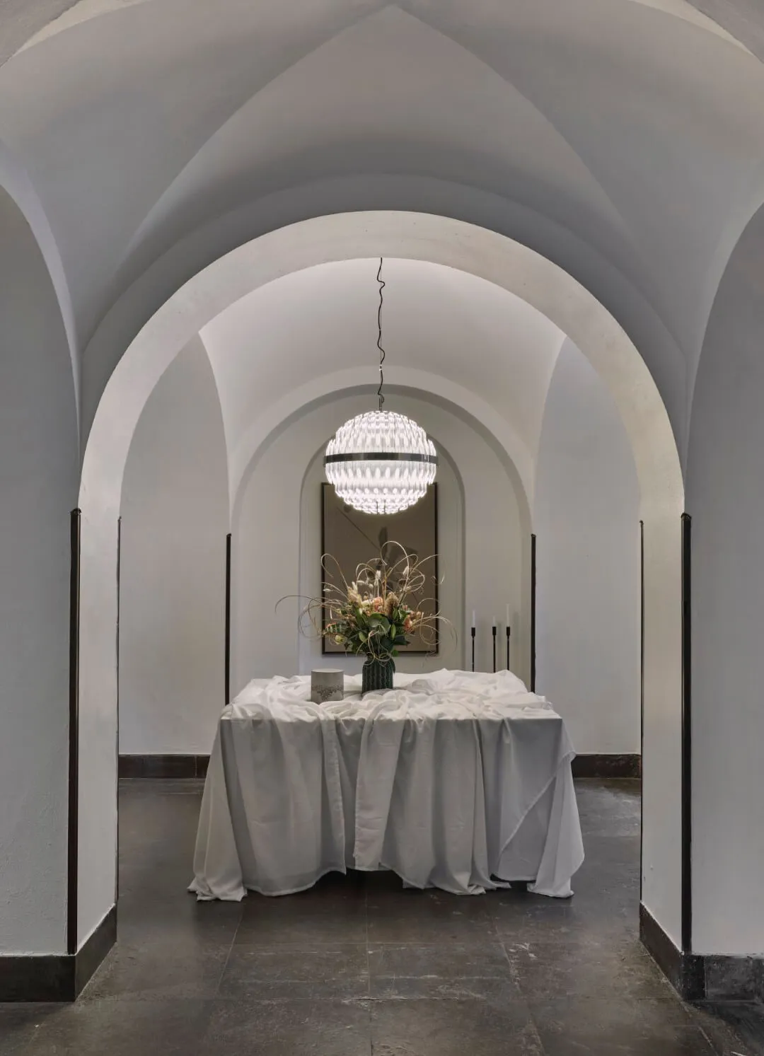 Helios is an aspiration to reinvent the classical chandelier – but instead of reflecting and diffusing, the rods project and enhance the light. Each of the 232 acrylic rods are lit by an individual LED, hidden in the centre of the lamp.