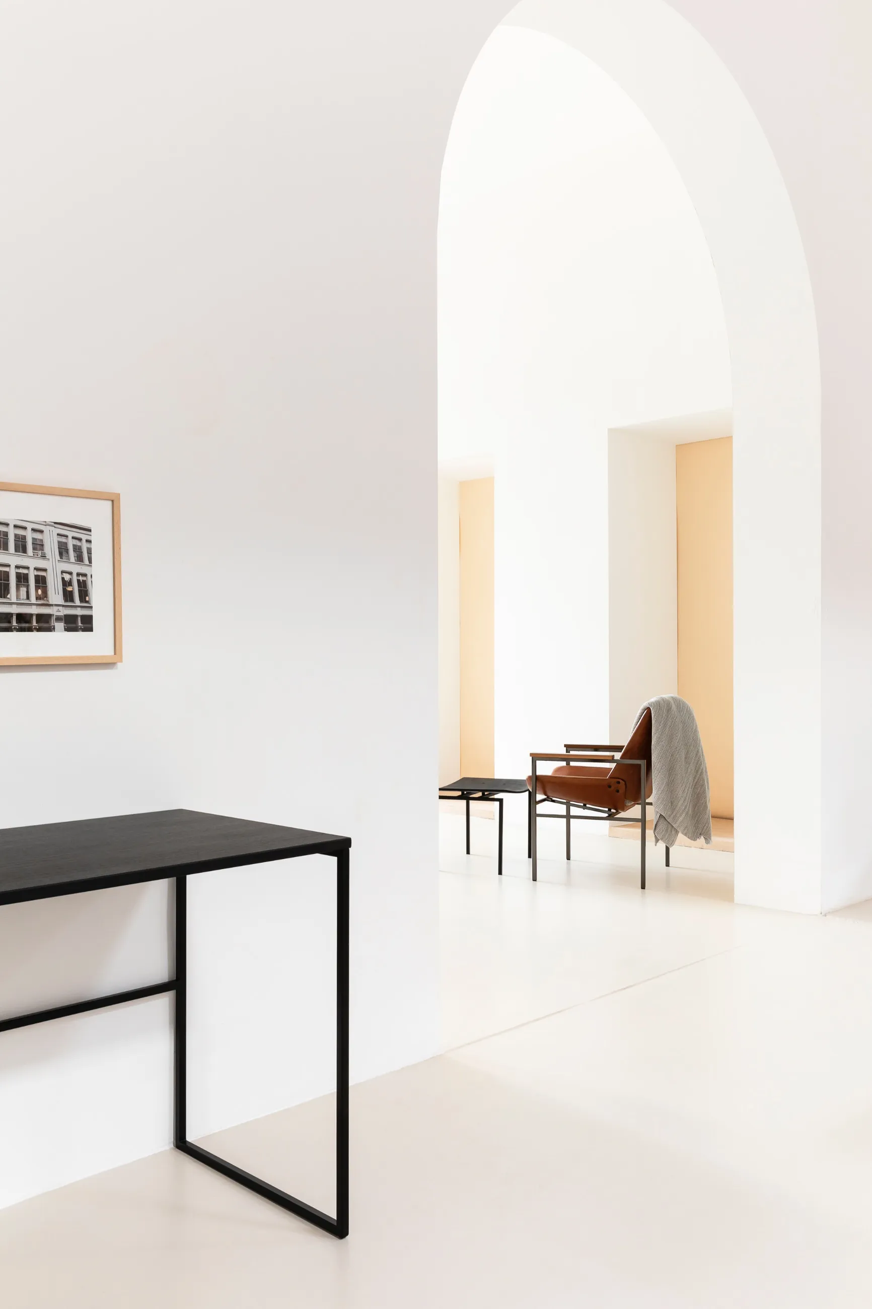 The Shell Ottoman design features a distinct curved plywood top that appears to float effortlessly above the square metal frame below. It is the perfect complement to either of the Shell Lounge Chair or Square Armchair.