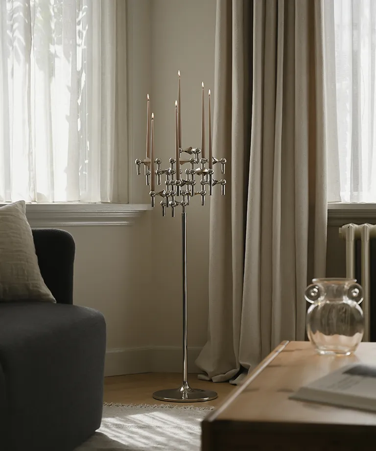 Discover sophisticated ways to display your Stoff Nagel collection by transforming the candle holder into an elegant floor sculpture. The floor stand can be styled with either the classic Stoff Nagel candle holder or the renowned BMF candle holder, allowing you to create a personalised sculptural arrangement.