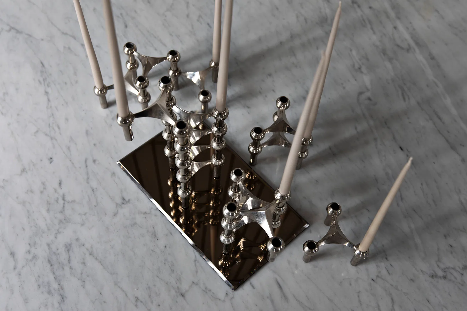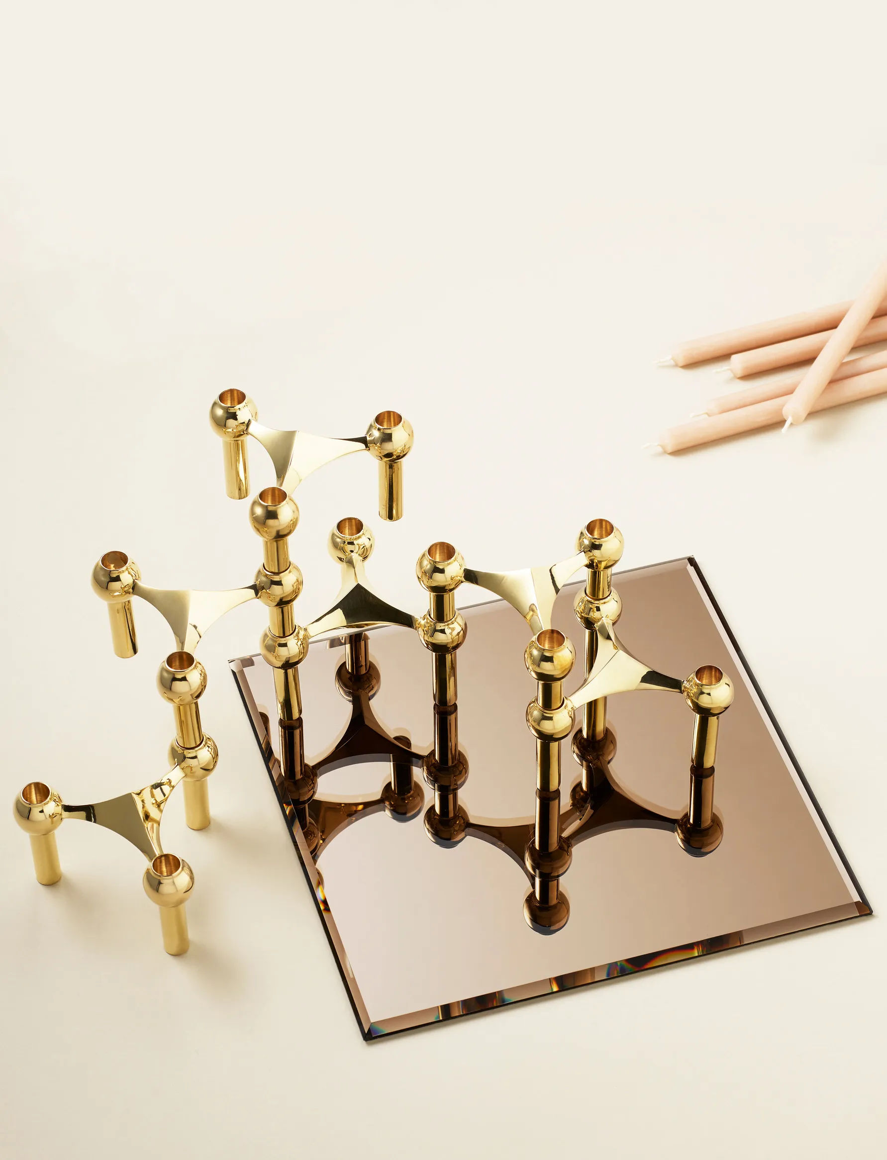 Glass Base is an exclusive addition to the Stoff Nagel family. The special mirror effect embraces the light and elegantly captures the sculptural reflections of the candle holders.