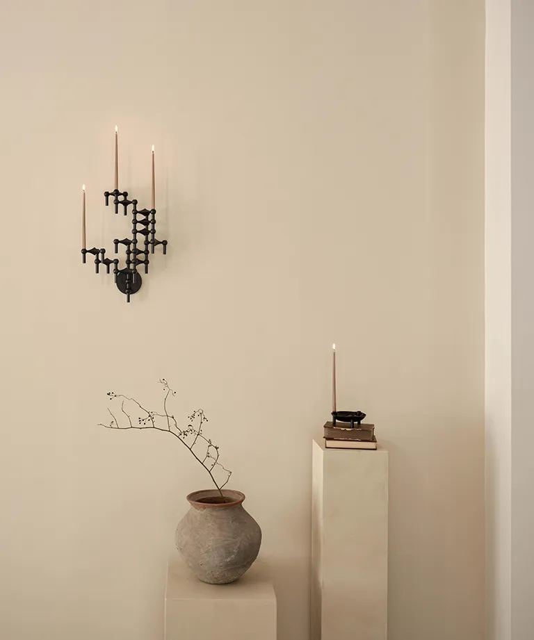 The wall hanger is designed to expand the visual possibilities of the Stoff Nagel candle holder. Inspired by the iconic Stoff Nagel design, the wall hanger makes it possible to create unique sculptures from vertical surfaces in endless combinations with the candle holder, bowl and vase. The wall hanger is understated and discreet, encouraging the exploration of individual ways to exhibit your Stoff Nagel collection.
