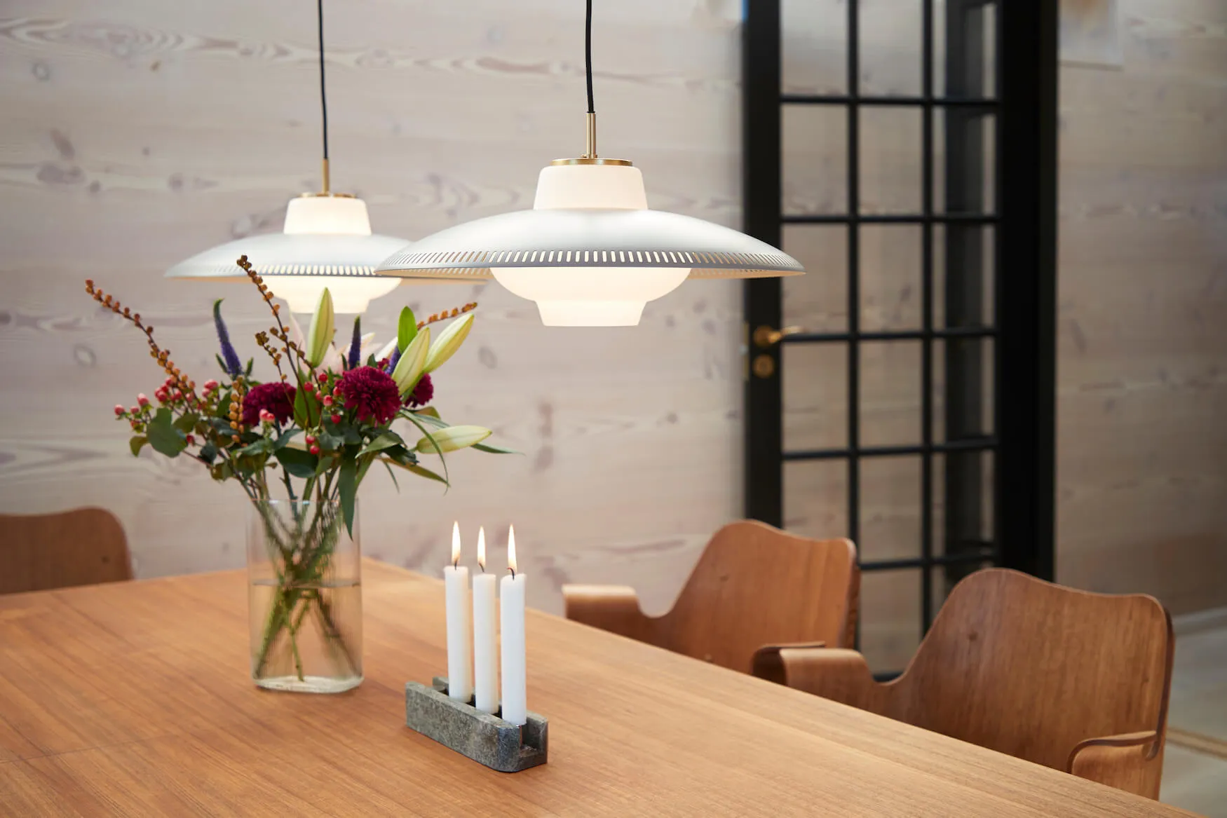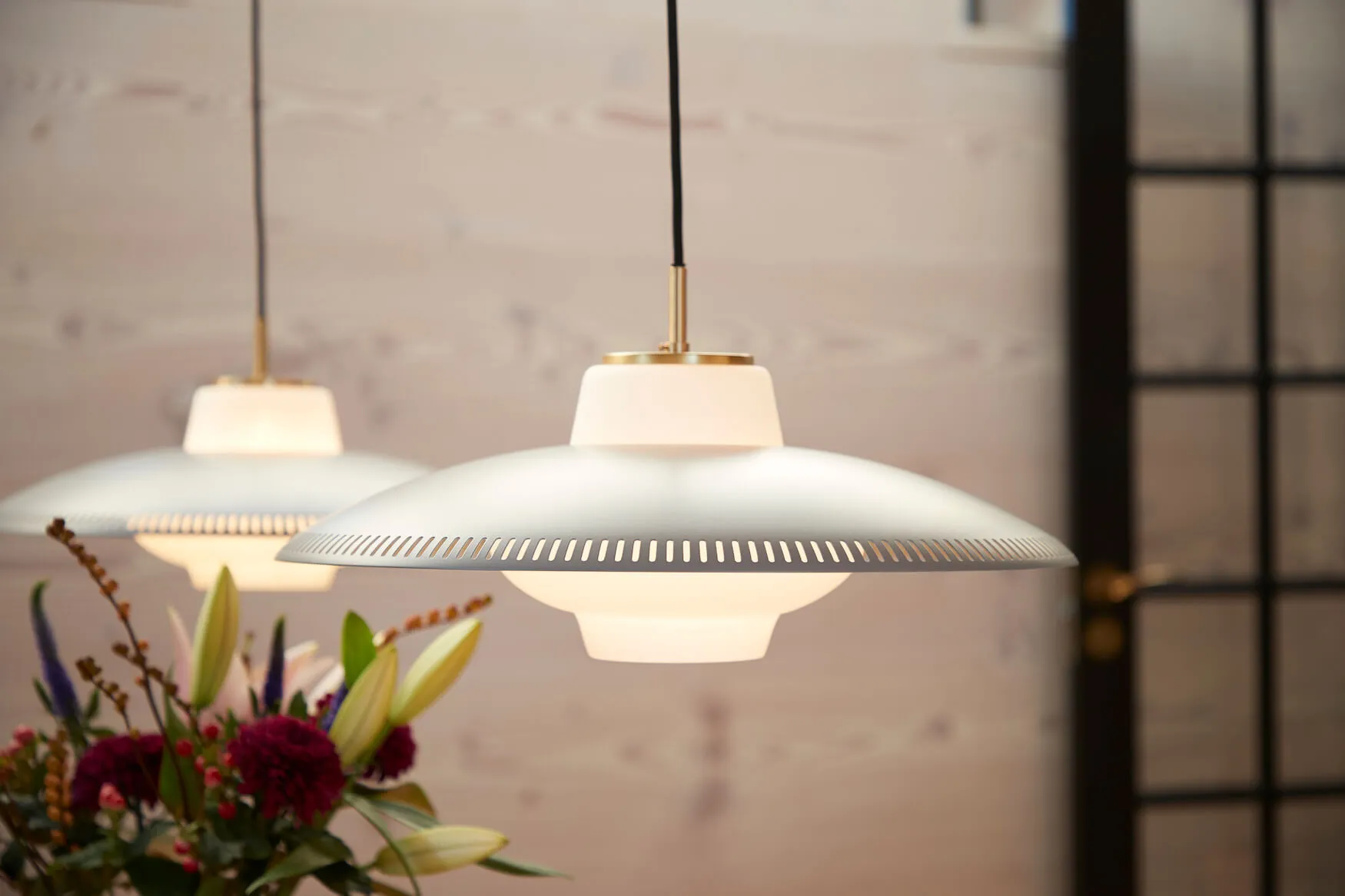 Danish light master Svend Aage Holm-Sørensen has masterminded the Opal Shade pendant designed in the 1950s. Opal glass offers something special when it comes to light, and the internationally renowned light designer chose opal glass for the Opal Shade pendant to create a special warm glow. Combined with the grooves in the wide metal shade, this creates an exciting and elegant light effect.