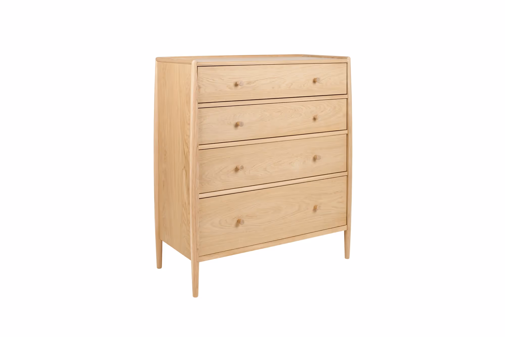 Elevate the everyday with the Winslow 4-Drawer Chest by Ercol, a contemporary staple crafted from vibrant oak that reveals the wood’s natural character. Four generous drawers, built with traditional dovetail construction and reinforced with finger joints, keep clothing neatly ordered while promising lasting strength.