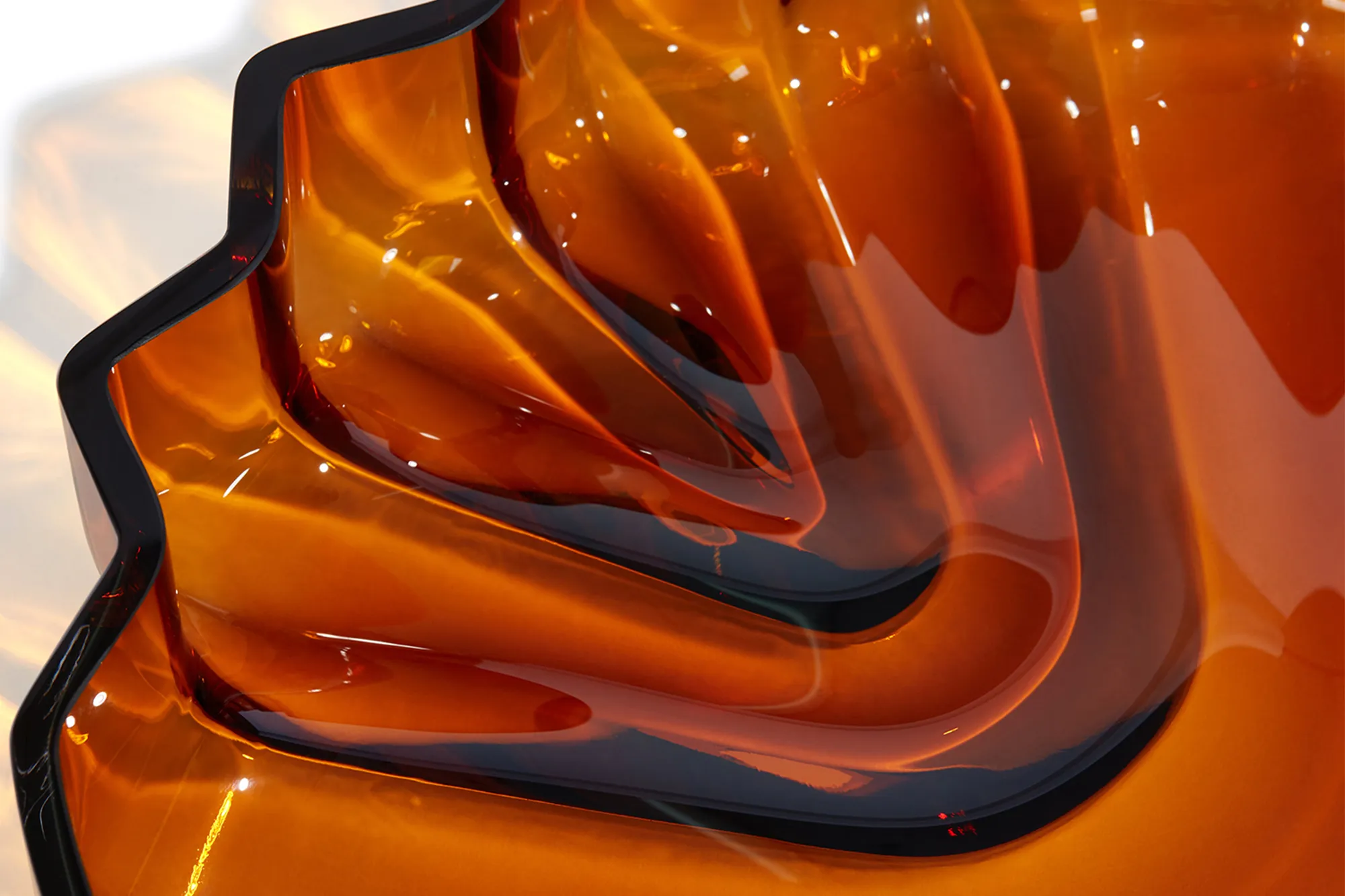 Sharing the same formal design language of the Pulse family of objects, the greater breadth of the Pulse Platter produces slightly deeper ripples of glass, which radiate from the centre. The result is an elegant pattern of vertical waves around part of its circumference, highlighting the asymmetry of the design within a perfectly symmetrical form.
